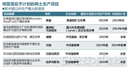 丰田通商是一家以丰田为主要客户、积极采取措施来确保稀土权益的公司。该公司表示,“很遗憾,稀土项目都没有进入正式生产阶段”。在日本政府的支持下,该公司计划在印度、越南及印度尼西亚等地进行稀土生产。这些项目原定于2013年开始生产,但都未如期实现。