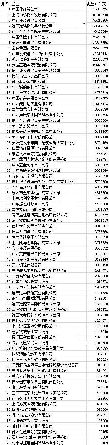 中国铁合金网讯:2014年6月中国铬矿进口量为78.69万吨,环比增14.87%,同比增11.99%;其中南非53.68万吨,环比增31.27%,同比增56.05%,土耳其8.36万吨,环比减3.81%,同比减45.85%,下面是当月铬矿进口企业排名及进口量。