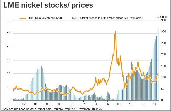 [导读]库存的增加已令指标镍价CMNI3承压,自5月触及27个月高点每吨21,625美元以来下挫了15%。分析师称,若库存继续增加,镍价还要下跌。