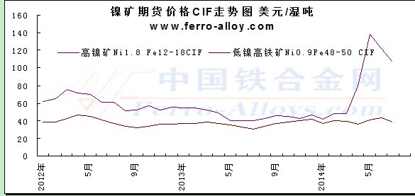中国铁合金网讯:高品位镍矿期货价格近几年呈梯度下滑状况,2013年后半年一直处于低位运行,在2014年年初受印尼政策影响,开始稳步回升,尤其是二季度出现了大幅上涨。2014年前五个月高品位镍矿1.8%CIF中国主港月度均价由42美金上涨至138美金,累计涨幅至少为96美金/湿吨,而6、7月份随着需求的减弱,高镍矿期货价格快速下滑至107美金/湿吨,跌幅约31美金/湿吨。