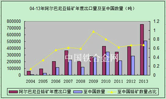 中国铁合金网讯:阿尔巴尼亚是中国铬矿进口主要来源国之一,而且由近十年中国铬矿进口数据来看,阿尔巴尼亚铬矿占中国铬矿进口比重基本呈现震荡上扬趋势。2013年中国铬矿进口总量达到了1209万吨,其中,阿尔巴尼亚矿为67.6万吨,占总量的5.5%。