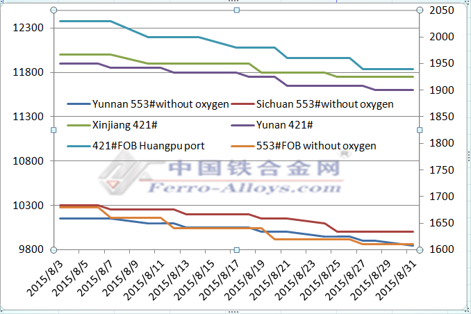 本月化学级金属硅面临小幅下跌态势,新疆从八月初12000元/吨到月底11800元/吨,下跌200元/吨,云南11800元/吨到月底11500元/吨,下跌300元/吨。目前市场整体成交清淡,需求没有大幅上涨迹象,故8月份整体市场依然供求紧张和价格小幅下跌。