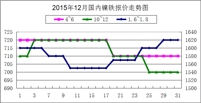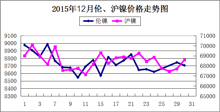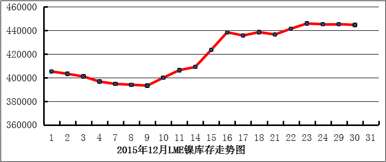 【中国铁合金网】2015年12月国内外镍价均剧烈震荡并且整体上弱势走低。伦敦交易所(LME)镍库存呈上涨趋势,目前回到44万吨高位。12月30日,伦敦综合镍收于8705美元/吨,镍库存报于444702吨。