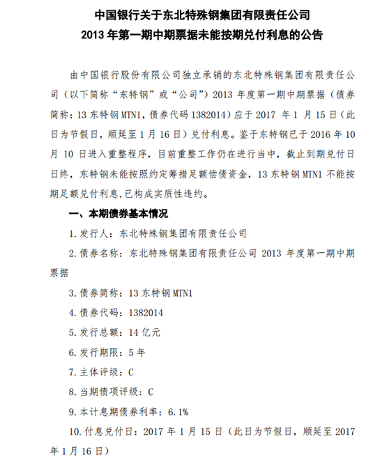 中国铁合金网讯:1月16日,据中国银行关于东北特殊钢集团有限公司的公告称,东北特钢2013年第一期中期票据未按期足额兑付利息,13东特钢MTN1已构成实质性违约。据悉,东北特钢去年已出现数次违约。