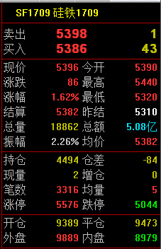 中国铁合金网讯:2017年5月19日15点硅铁期货硅铁主力1709收盘5396.0,涨幅1.62%,结算价5382.0,成交18862手.