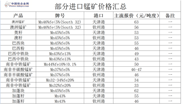 南非半碳酸块矿报5.25美元/吨度,环比上月上调0.75美元/吨度。康密劳6月份第二轮报价:MN 44.5%加蓬矿块报价6.10美元/吨度,环比上个月上调0.20美元/吨度。MN43%加蓬籽矿暂未报价。BHP 锰矿暂未报价。本次价格上涨的幅度较大,对当前市场信心得到提振。 据了解,截止到6月2日,锰矿港口库存有266.9万吨,其中天津港库存有185-190万吨,钦州港有66-70万吨,较上一周减少20万吨左右,当前的锰矿库存明显的减少,对锰矿价格方面持稳得到一定的支撑。