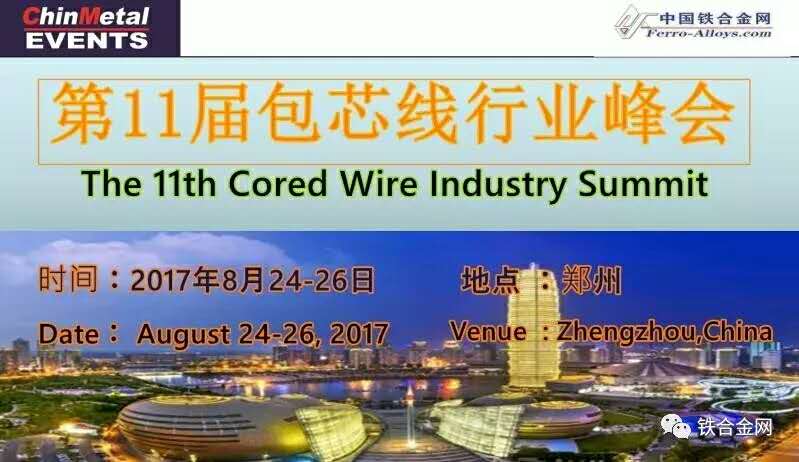 由中国包芯线行业协会(筹)和中国铁合金网(FERRO-ALLOYS.COM)举办的“第十一届包芯线行业峰会”将于2017年8月24日-26日在郑州召开。