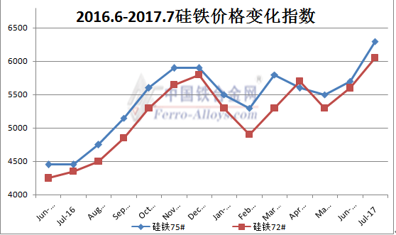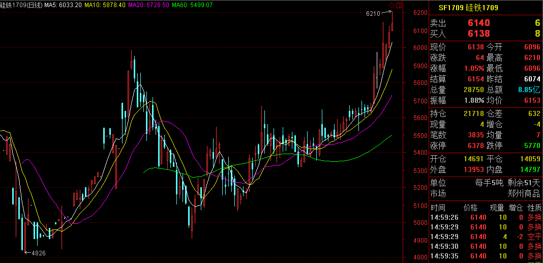 近一年硅铁价格表现来看,硅铁市场可谓波动较小稳定运行,硅铁72#,75#价格已经超过2016年来最高价5950元/吨、6100元/吨,截止今日国内72#、75#价格都已双双过六千,同时南方两家钢铁企业对8月份采购价每吨已经上调370元、520元不等,截止到今日硅铁市场表现仍旧强劲,现货,期货价格几乎同步,今日下午15时,硅铁1709合约收盘价为6138,最高价为6210,成交量28750手,近几日硅铁期货依旧一路飘红,持续突破,具体表现如下:
