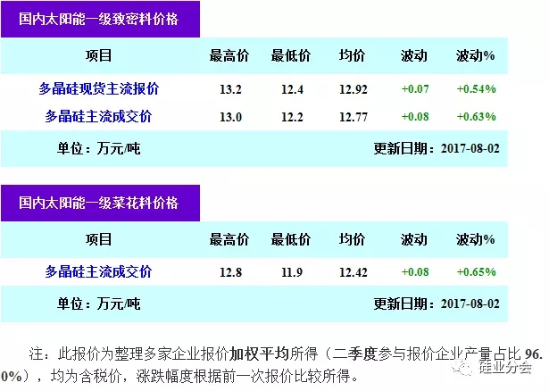 本周多晶硅现货价格小幅上涨,一级致密料成交价的三个区间为:高价13.0万元/吨,主流价格12.5-12.9万元/吨,少部分价格在12.2-12.4万元/吨。本周硅料供应仍然偏紧,主要是江苏中能开始安排小部分装置停车检修,再加之其他一线厂商包括中硅、永祥负荷未满,导致国内市场供应量缩减,因此本周硅料企业只要手中有料可签,下游愿以更高价成交,但实际目前由于各多晶硅企业都几乎无任何可以在8月份交出的硅料,本周大多企业以执行前期订单为主。
