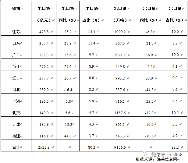 前十出口省市出口额占比高达80.2%。作为我国“两高一资”商品出口的主要省份,江苏省出口473.8亿元,同比增长25.2%,出口量为1009.2万吨,同比下降了6.8%。在出口额前十省市中,除了河北、上海、天津的出口额下降以外,其余省市出口额均有不同幅度的增长,其中增幅最多的为福建省,出口116.1亿元,同比增长44%;而出口量则普遍下降,仅广东、辽宁由于资源性产品出口量的增幅显著而导致“两高一资”商品出口总量也呈增长表现,其出口量分别为2091.2万吨和993.2万吨,分别增长了36.9%和23%。其中,广东省出口资源性产品1727.5万吨,同比增长47.2%,占广东“两高一资”商品出口量的82.6%。其中,非金属矿产品出口1689.7万吨,同比增长了49.2%,占比高达80.8%,广东省主要出口至香港、越南、台湾等地区;辽宁出口资源性产品449.1万吨,同比增长2倍,占辽宁“两高一资”商品出口量的45.2%。其中,非金属矿产品、金属矿砂、矿物燃料出口量均大幅增长,分别为173.7万吨、87.2万吨、186.2万吨,分别同比增长42.7%、391倍和5倍,辽宁省主要出口至韩国、日本、越南。