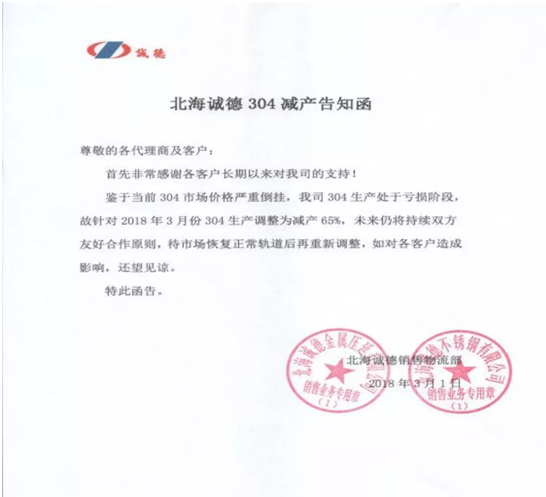 中国铁合金网讯:3月1日晚上消息,北海诚德镍业有限公司减产304。原因是价格与成本出现倒挂。不过,这个消息应该是对此前释放信息的进一步说明,北海诚德3月份转产400系6-7万吨。