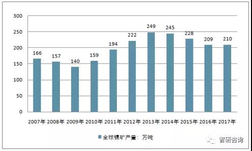 【中国铁合金网讯】2017年全球探明镍基础储量约7400万吨,资源总量14800万吨,基础储量的约60%为红土镍矿,约40%为硫化镍矿。2017年全球镍矿产量为210万吨,2016年全球镍矿敞亮为209万吨。