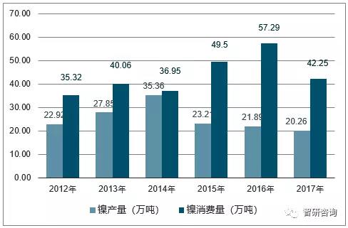2017年中国镍产量为20.26万吨,同比下降7.47%;2016年中国镍产量为21.89万吨。2017年中国镍消费量为42.25万吨,同比下降26.25%;2016年中国镍消费量为57.29万吨。