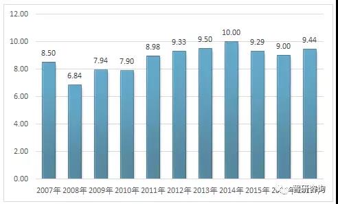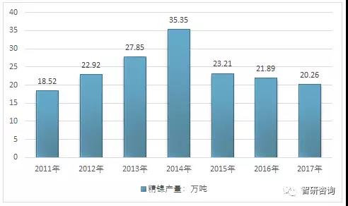 2015年我国镍精矿(镍含量)产量约9.29万吨,同比2014年的10万吨下降了7.1%。2016年我国镍精矿产量下降到9万吨,2017年我国镍矿产量为9.44万吨,2017年同期我国精镍产量达到20.26万吨。