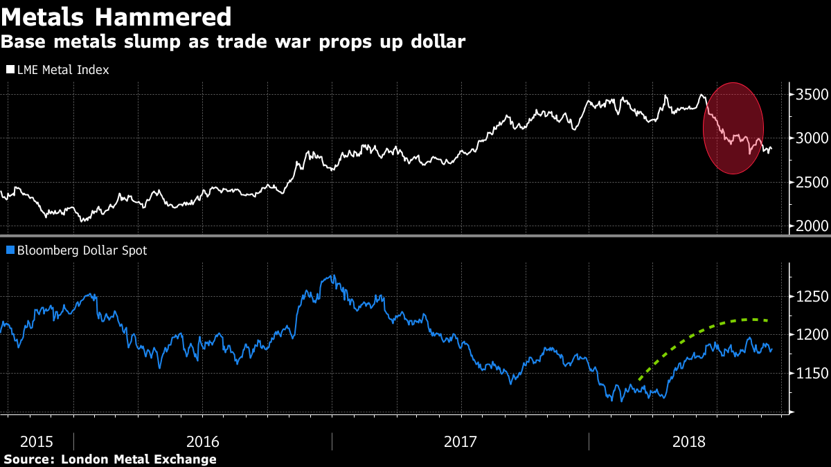金属价格承压已经超过一个月了。美国引起的贸易战使得人们担心,两个经济增长最为强劲的经济体将会进行最终的摊牌。坚挺的美元变得更加昂贵,使得中国的买家承受更高的价格来进口工业用期货。