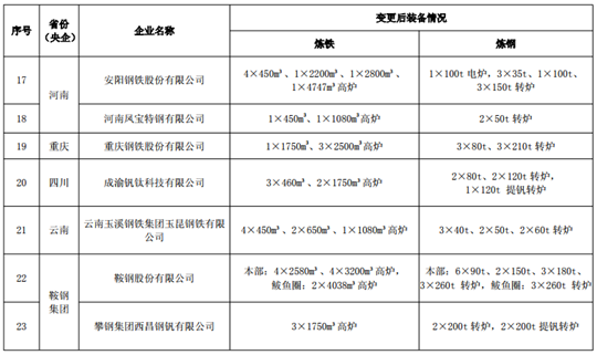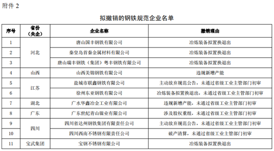 根据《钢铁行业规范条件(2015年修订)》和《钢铁行业规范企业管理办法》,工业和信息化部持续开展钢铁规范企业动态调整工作。经企业自查、地方工业主管部门初审、工业和信息化部组织专家核实,其中,12家企业符合《钢铁行业规范条件》,拟列入规范企业名单;11家企业存在违规新增产能、冶炼设备拟全部关停退出等情形,拟撤销规范公告;17家企业存在环保、安全等问题,拟责令整改;27家企业冶炼装备变化、7家企业名称变化,拟予以变更。
