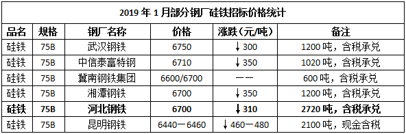 另,云南某钢厂12月硅铁75B招标价格敲定为6440—6460元/吨(现金含税),较上一月价格下跌460—480元/吨,采购数量2100吨,环比增量1100吨。2019年1月份部分钢厂硅铁招标汇总如下: