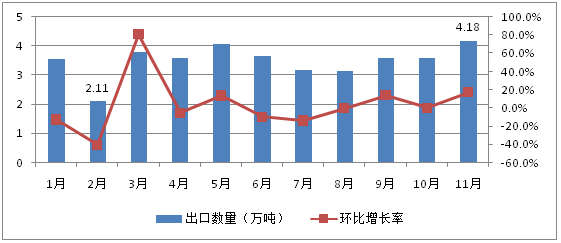 2018年1-11月全国出口锰及其制品(包括废碎料)42.08万吨 ,其中,锻轧锰及锰制品出口量3.65万吨,电解锰(未锻轧锰,废碎料,粉末81110010) 出口量38.43万吨,占总出口量的91%,较去年同期减少2.7%。