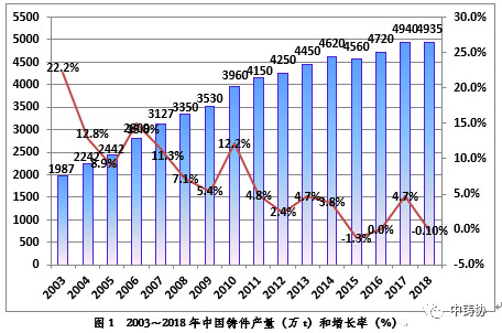 自2000年,中国铸件产量整体呈正增长态势;自2011年由“高速增长”转化为“中低速增长”。在此期间,2015年出现1.3%的下降,2018年总产量较上一年略有下降(见图1)。