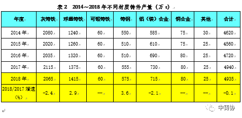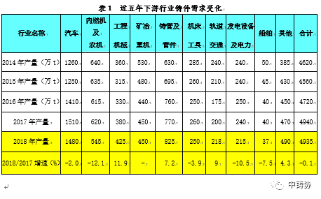 他说:“2018年中国各类铸件总产量4935万吨,与2017年基本持平;下游行业铸件需求结构变化明显。”