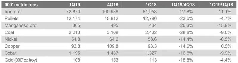 【中国铁合金网讯】日前,淡水河谷发布2019年第一季度产销量报告。