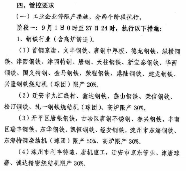 方案显示,此次的管控时间比前几个月延长,为自2019年9月1日至10月4日。管控行业包括钢铁、焦化、水泥、玻璃、铸造等工业企业。通知要求唐山市各个县区要将涉及停限产企业纳入停限产清单,要明确到具体企业、具体装备、具体时间和限产产量。