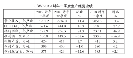 受钢材发货量环比大幅下滑和平均销售价格同比下跌等因素共同影响,第一财季JSW营业收入环比大幅减少11.4%至1981.2亿卢比,同比也小幅下降3.4%;息税、折旧及摊销前利润(EBITDA)环比大幅下滑16.3%至371.6亿卢比,同比也显著减少27.2%;税前利润环比和同比分别显著下降24.3%和46.9%至178.9亿卢比;净利润环比和同比分别显著缩水32.6%和56.9%至100.8亿卢比。