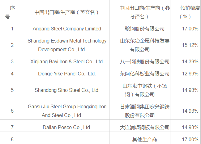 【中国铁合金网讯】2019年10月7日,欧亚经济委员会发布第2019/188/AD26号公告,对原产于中国和乌克兰的进口镀锌钢板产品(俄文:оцинкованный прокат)作出反倾销肯定性终裁,认定中国和乌克兰的镀锌钢产品存在倾销、对欧亚经济联盟区域的相关产业构成了实质性损害,同时,倾销与实质性损害之间存在因果关系,故建议对中国涉案企业征收等同于倾销幅度12.69%~17.00%的反倾销税(倾销幅度详见下表),对乌克兰马里乌波尔伊里奇冶金联合公司(国际矿业冶金集团公司)及乌克兰其他生产商征收23.90%反倾销税,有效期为5年。涉案产品税号为7210490001、7210490009、7210610000、7212300000、7212506100和7225920000。