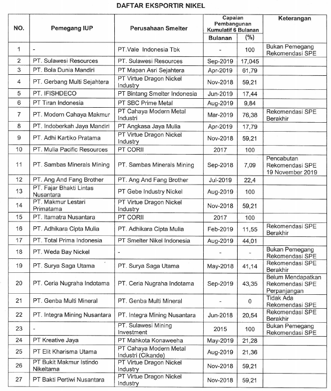 镍矿企业在获得镍出口批准(镍矿品位<1.7%)之前,公司必须首先获得矿产和煤炭总干事的推荐,只有在公司已达到国家指定设施(冶炼厂)建设的实际进度时才能提出推荐(附图如下)。