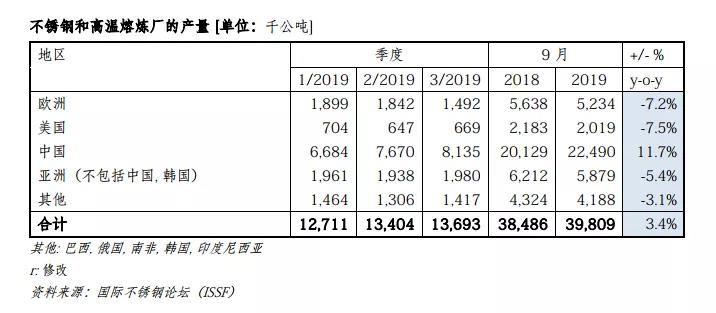 【中国铁合金网讯】国际不锈钢论坛(ISSF)12日发布的2019年前三季度数据表明,全球不锈钢粗钢产量与去年同比增长3.4%,达到3981万公吨。