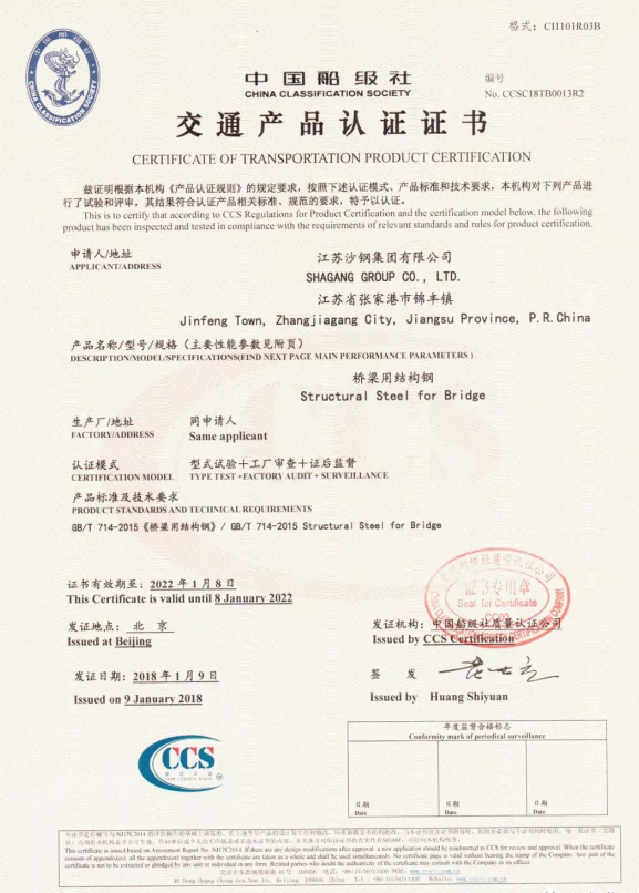 日前,沙钢桥梁钢板Q345qD/E、Q370qD/E、Q420qD/E、Q500qD/E凭借其强大的生产技术和过硬的产品质量顺利通过了中国船级社质量认证公司的产品认证审核。