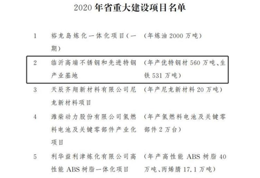 【中国铁合金网讯】近日,山东省政府网站发布《山东省人民政府关于下达2020年省重大项目名单的通知》(以下简称《通知》),公布了2020年山东省重大建设项目名单和2020年山东省重大准备项目名单,其中临沂高端不锈钢和先进特钢产业基地项目在列。