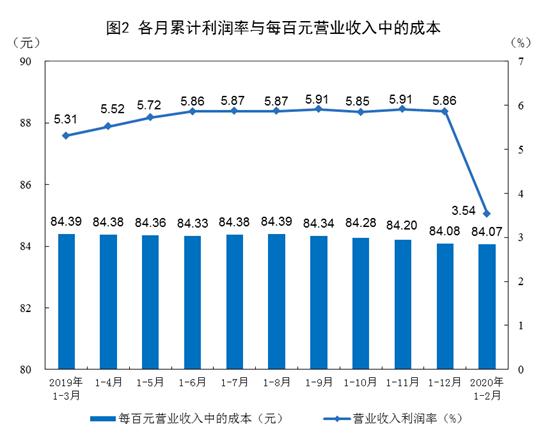 1—2月份,规模以上工业企业实现营业收入11.62万亿元,同比下降17.7%;发生营业成本9.77万亿元,下降17.8%;营业收入利润率为3.54%,同比降低1.17个百分点。