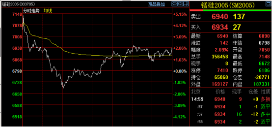 硅锰期货2005合约,今日最高价7050,结算6890;涨2.9%,收盘价6940,今日较昨日涨停盘面小幅下调,期货不具备长期上涨空间,综合现货市场,期货短期看涨,长期仍不乐观。