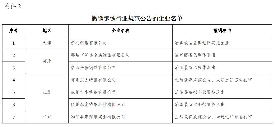 2.撤销钢铁行业规范公告的企业名单