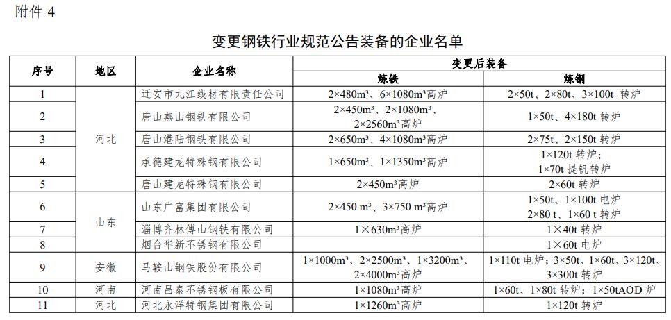 4.变更钢铁行业规范公告装备的企业名单