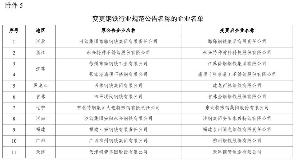 5.变更钢铁行业规范公告名称的企业名单