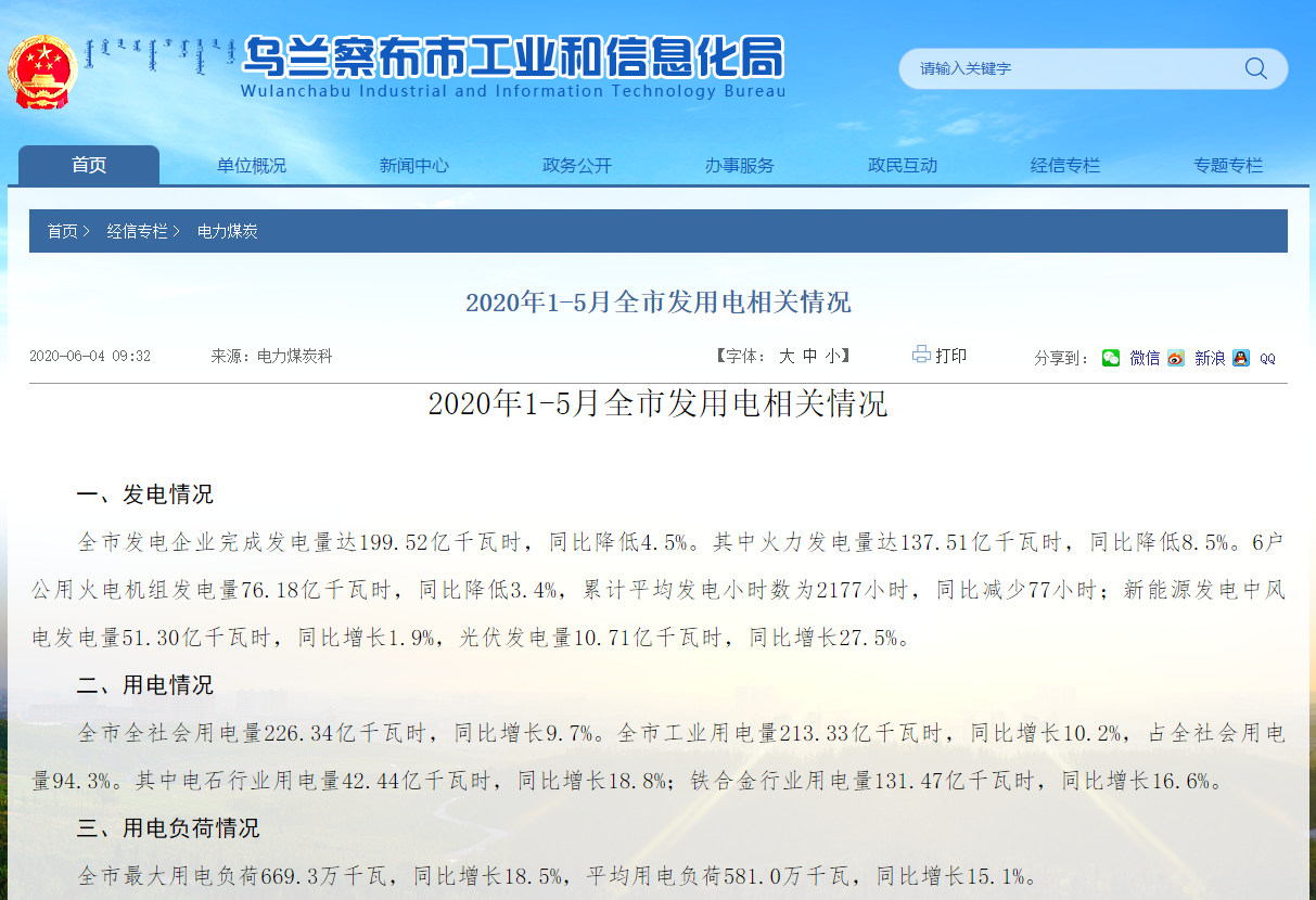 中国铁合金网讯:2020年1-5月乌兰察布全市发用电相关情况