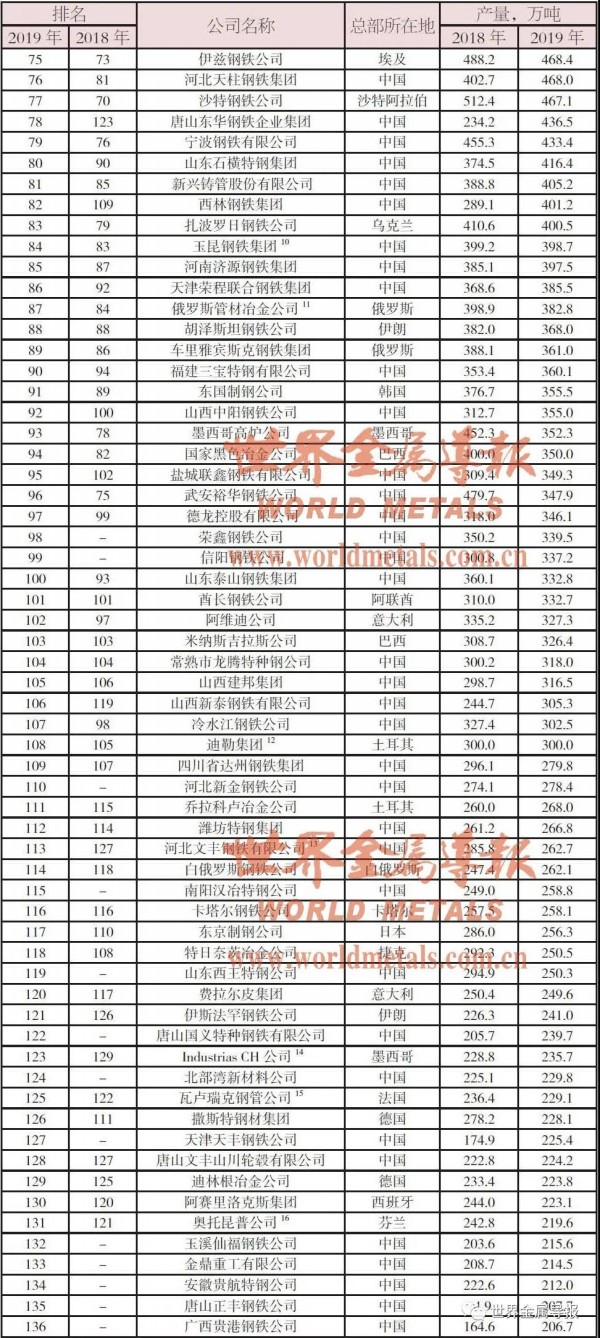 中国铁合金网讯:英国行业研究机构《金属通报》(Metal Bulletin)6月初公布2019年全球钢铁企业粗钢产量排名。今年全球共有136家钢铁企业粗钢产量超过200万吨,比去年多六家;榜单新增企业16家,均为中国钢铁企业。部分企业停产减产或出售钢铁资产而降低了产量;而部分钢企则通过产能新扩建或并购重组提高了粗钢产量。