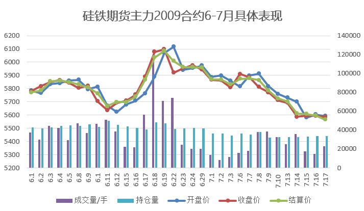 【期货行情】本周硅铁期货主力2009合约开盘价5,732,最高价5,742,最低价5,524,收盘价5,584,结算价5, 566,持仓量33,809,成交量116,329。