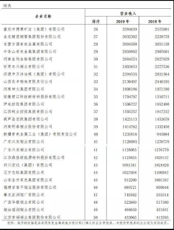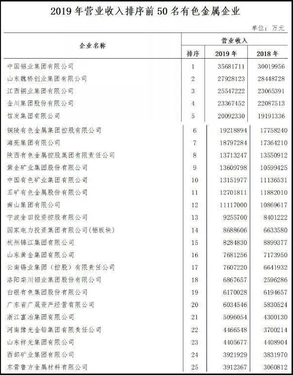 中国铁合金网讯: 7月21日,在中国有色金属工业协会召开的上半年行业运行情况视频新闻发布会上,同步发布了2019年有色金属工业营业收入前50家企业排序情况。中国有色金属工业协会副会长兼秘书长贾明星公布排序结果。