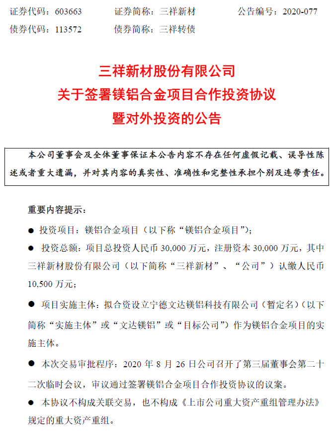 为了推进公司在新材料行业的战略发展规划和布署,不断丰富公司产业链,公司拟与宁德时代新能源科技股份有限公司(以下简称“宁德时代”)、江苏万顺机电集团有限公司(以下简称“万顺集团”)、中山市隽达股权投资管理企业(有限责任合伙)(以下简称“隽达投资”)、中山银泰股权投资管理企业(有限合伙)(以下简称“银泰投资”)共同投资镁铝合金项目。本次镁铝合金项目的实施主体暂定名为宁德文达镁铝科技有限公司,注册资本为30,000万元,宁德时代、万顺集团、三祥新材、隽达投资、银泰投资按25%:17%:35%:9%:14%的比例共同投资镁铝合金项目。