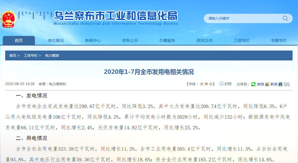 全市全社会用电量323.38亿千瓦时,同比增长11.2%。全市工业用电量303.4亿千瓦时,同比增长11.5%,占全社会用电量93.8%。其中电石行业用电量59.36亿千瓦时,同比增长18.6%;铁合金行业用电量185.2亿千瓦时,同比增长14.6%。