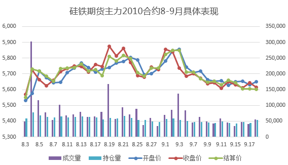 【期货行情】本周期货盘面仍处于窄幅下行趋势,硅铁期货主力2010合约开盘价5,626,最高价5,686,最低价5,568,收盘价5,614,结算价5,602,持仓量54,304,成交量224,457。