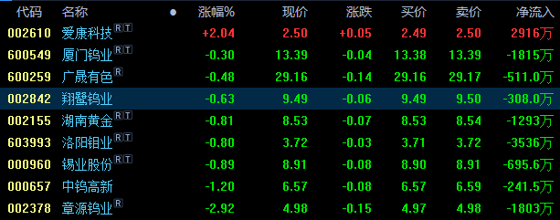 截至目前,钨上市公司开盘表现跌多涨少,爱康科技领涨超2%,厦门钨业、广晟有色下跌不足1%,翔鹭钨业、湖南黄金、洛阳钼业、锡业股份均跌近1%,中钨高新跌超1%,章源钨业跌近3%。