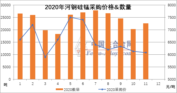 河钢集团公布11月硅锰价格6080元/吨,较10月定价下调50元/吨,采购量22600吨,较10月增加2280吨。具体采购价量价关系如下: