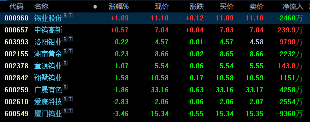 截止本周五收盘,钨上市公司涨少跌多,具体为:锡业股份涨超1%,中钨高新涨幅不足1%,洛阳钼业、湖南黄金跌幅均不足1%,章源钨业跌超1%,翔鹭钨业、广晟有色跌近2%,爱康科技跌近3%,厦门钨业跌超3%。