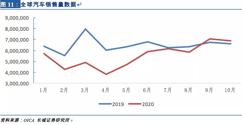 镁下游主要消费集中于汽车领域,同时海外汽车用镁占据主导地位。受制于海外疫情的波动,海外汽车厂复工节奏出现反复,导致镁价今年三季度前一直在行业成本线附近徘徊,未随着其他有色金属出现大幅反弹。10月份以来,随着全球汽车销售数据同比恢复正增长,疫苗预期逐步兑现,海外车企开工不断回升,镁价有望步入复苏周期。