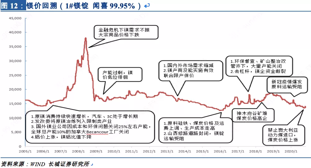 1. 镁没有期货交易市场,完全依赖现货交易,因此价格完全由上下游基本面决定,与工业金属在基本面决定价格趋势的基础上受到期货多头空头力量影响有较大差异。同时,由于没有期货交易制度,镁价也基本不受市场资金流动性的影响,因此当市场流动性匮乏时镁价没有如工业金属一般大跌。
