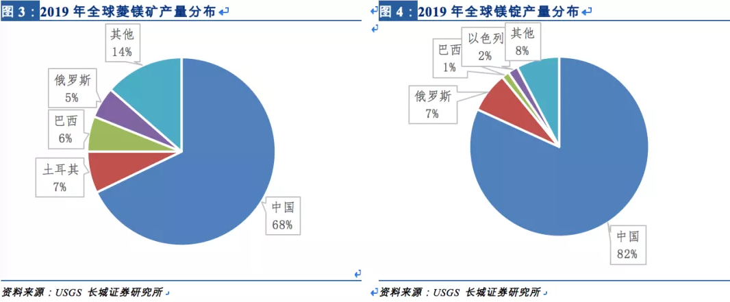 根据美国地质调查局数据,2019年我国菱镁矿产量1900万吨,占全球68%,是第二名土耳其产量的9.5倍;镁锭产量更是占据全球82%的份额。